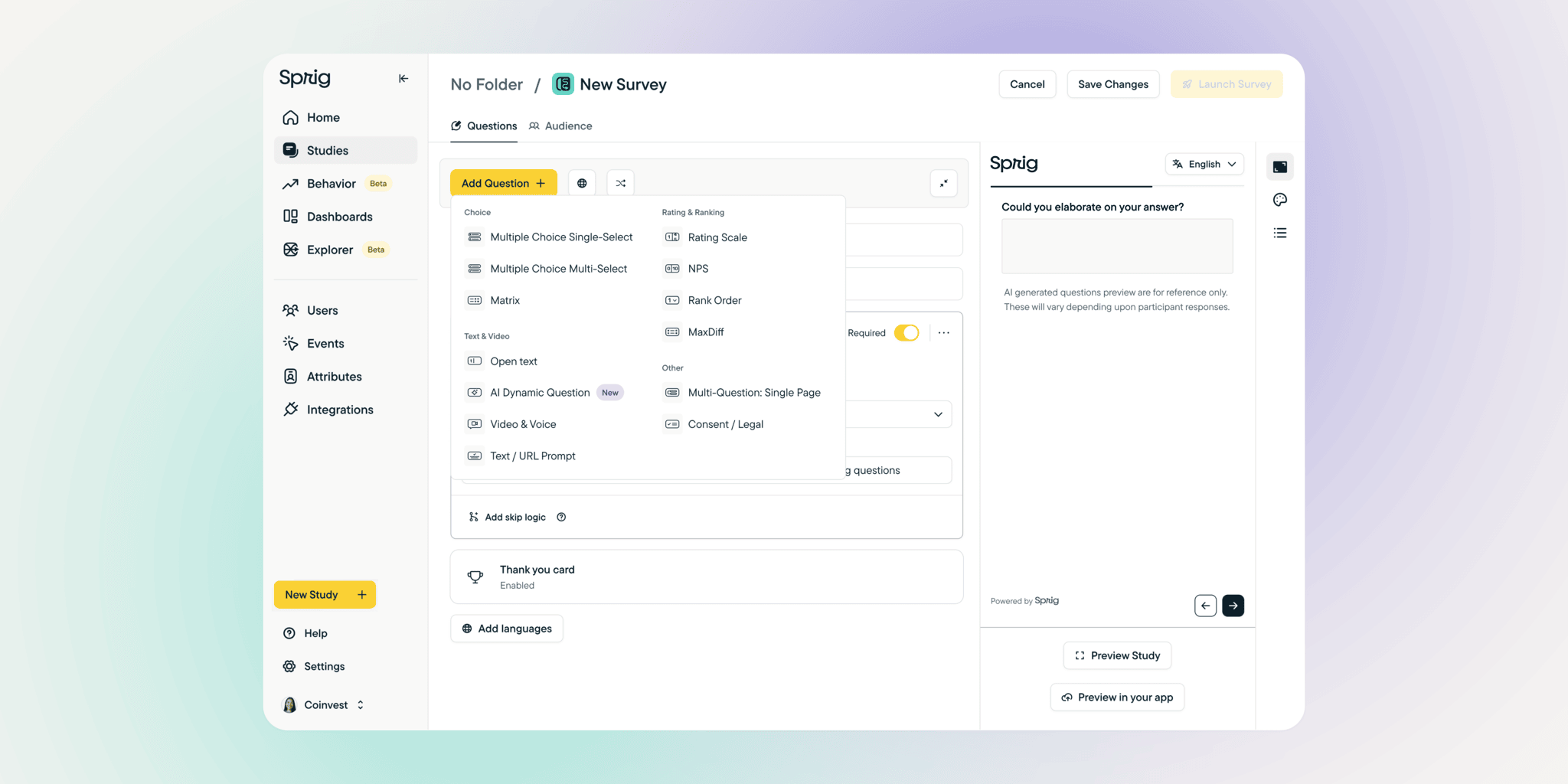 Sprig also reflects how today’s teams operate. It’s fast, design-forward, and built for cross-functional collaboration. When researchers move faster, the entire product team moves with them.